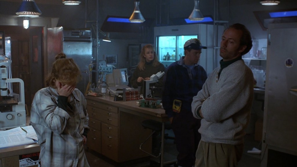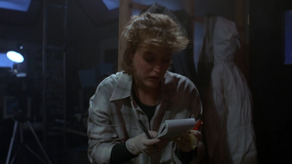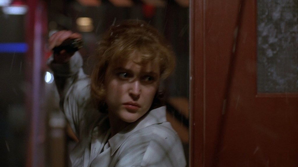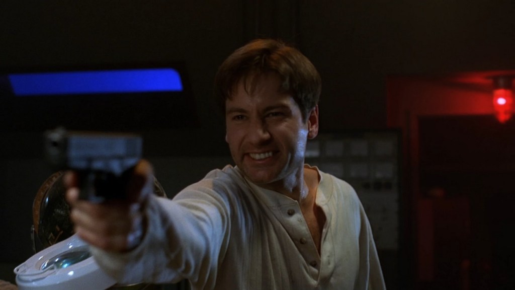 Then they discuss ammonia. It’s present in the dead peoples’ blood and the ice core. And Mulder realizes the ice cores had been taken in an area where there was a meteor crater… so aliens. While a boring piece of information, this episode marks perhaps the first mention of the black oil alien virus which… is kinda cool, but also what the eff. Suddenly aliens are making these people murderous?