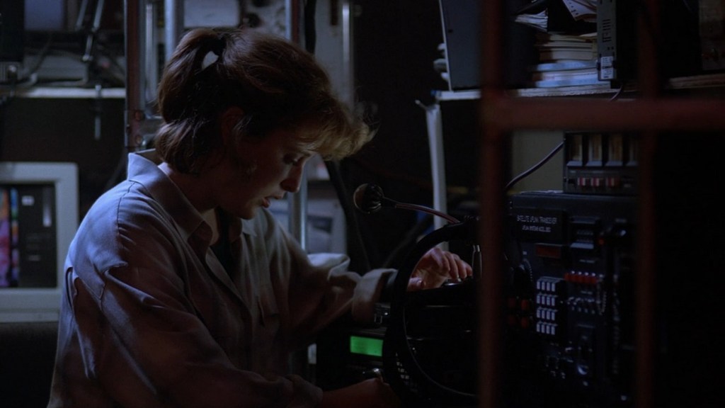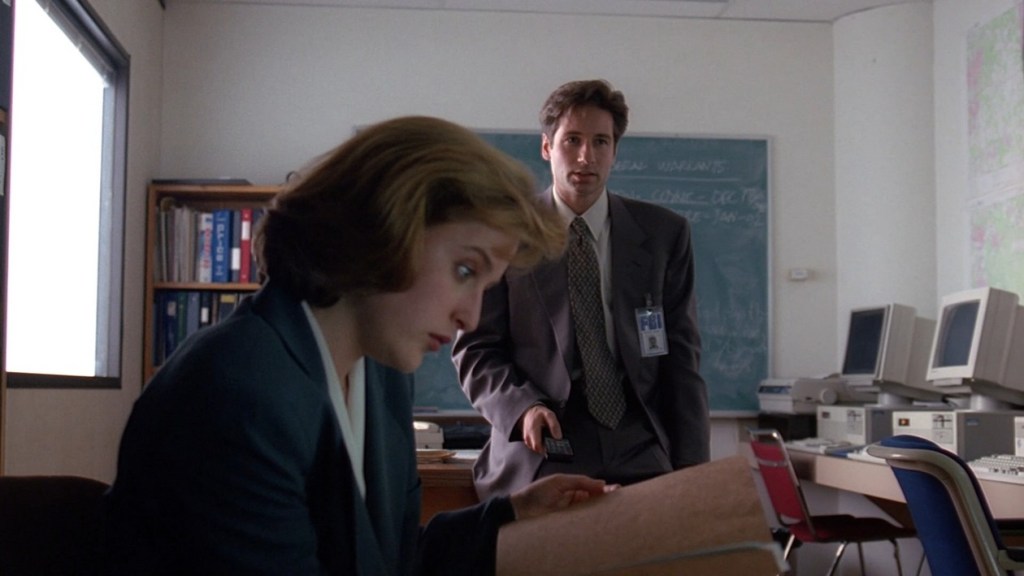 Mulder and Scully are lounging in what looks like a computer lab, watching a video of the Ice Core Project. I love this because the video on screen gives us a date that these events take place. 11/5/1993. By the way, where exactly are Mulder and Scully supposed to be in this scene? It’s not their office… Mulder explains they were given the assignment to figure out what happened to the scientists on the base because they all died, all five of them.