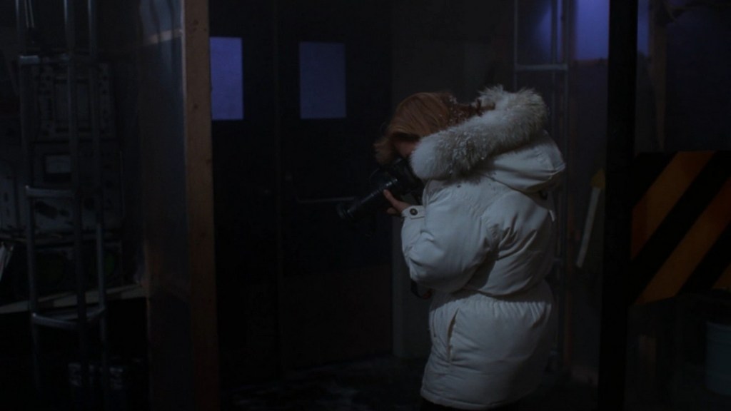 The team investigates the scene before them find that the ice core samples taken by the previous team are in a freezer with the door left open. They discuss what to do with the cores to keep them safe (I dunno, throw them outside where it’s -30F?). Scully meanwhile has this gigantic camera and lens and is photographing the base for evidence ($9.98 for a roll of film).