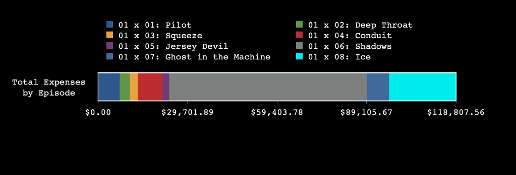 Naturally Scully and Mulder need to fly back to BWI ($796 each) and then taxi back to DC ($176.40). In total Mulder and Scully spent around $24,470.63 in today’s money on this adventure to the arctic. Nearly all of the budget this week was spent on air travel