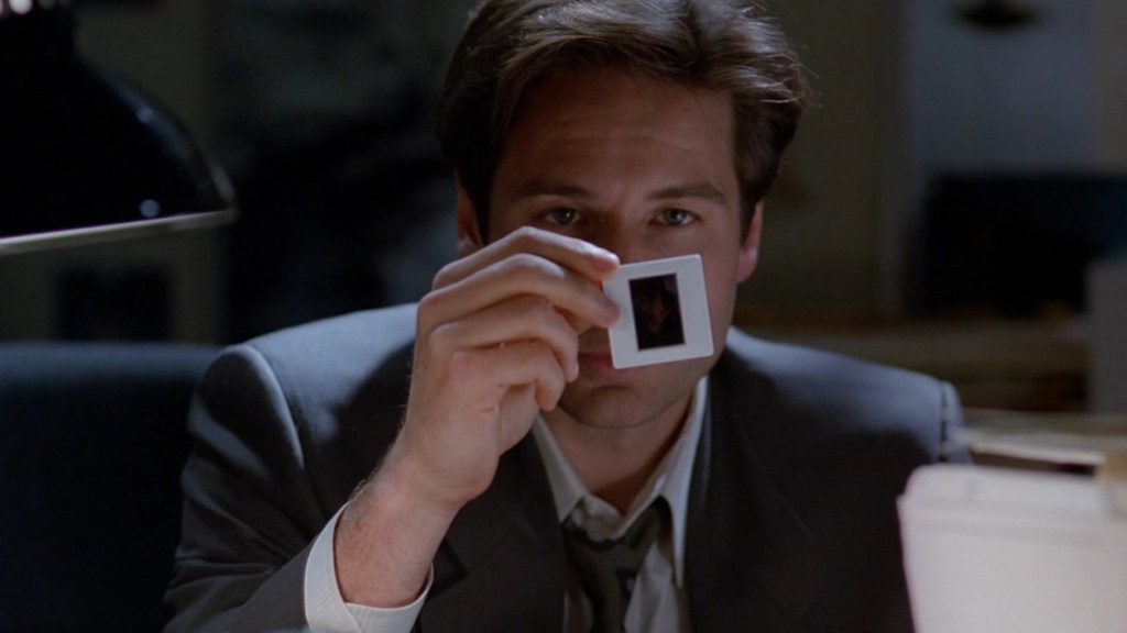In Mulder’s office he explains to Scully the details of this case. We see that he uses 3 slides, which currently would cost ~$25 to have developed and processed. We know that in the past Mulder has processed film on his own, but I doubt that he is capable of producing slides used here.